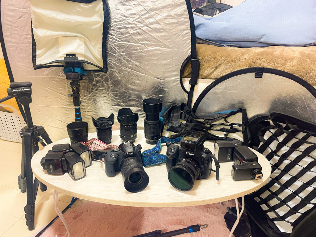 Nikon一眼レフカメラ2台、広角~望遠まで各種レンズ、ストロボ4台、レフ版、ソフトボックス、アンブレラ、三脚